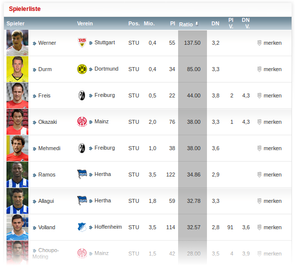 Go to http://manager.kicker.de/interactive/bundesliga/spielerliste/ and click the bookmarklet to get an additional column called "Ratio". The table gets sorted by this new value. It is simply the ratio between score and price, i.e. the score per price in millions. Currently, it is only tested on the mentioned page, but it possibly works on other ranking pages as well.